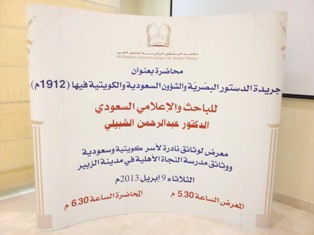 محاضرة جريدة الدستور البصرية والشئوون السعودية والكويتية فيها ١٩١٢ – ١٩١٣م أقيمت في مكتبة البابطين المركزية للشعر العربي في الكويت يوم الثلاثاء ٩ أبريل ٢٠١٣م حاضر فيها الباحث والاعلامي السعودي الدكتور عبدالرحمن الشبيلي