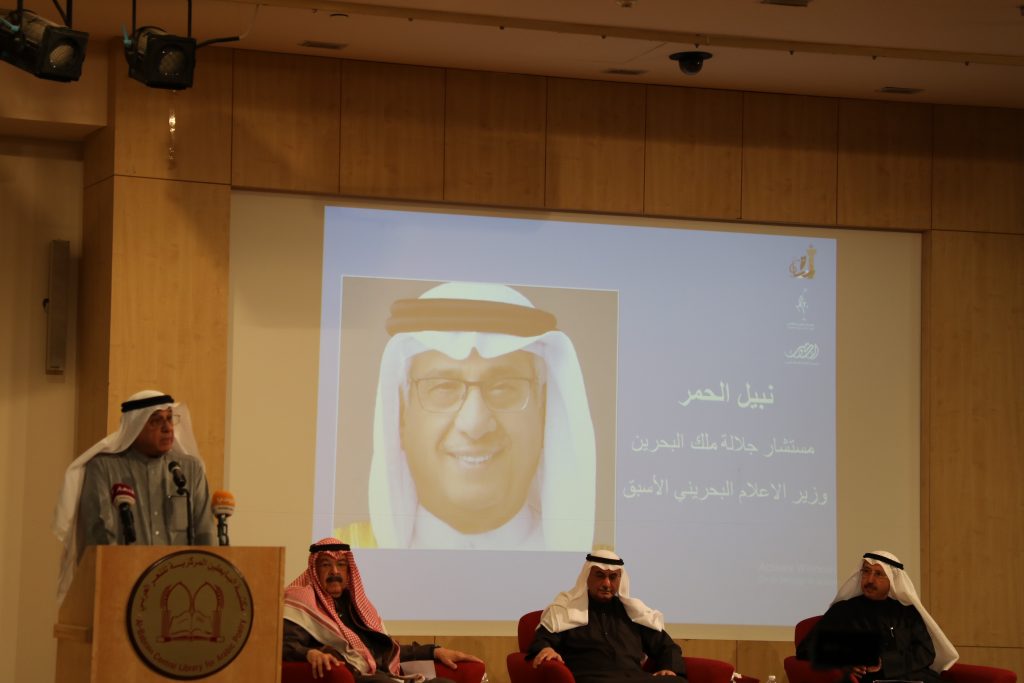 من جانبه قال مستشار ملك البحرين لشؤون الإعلام وزير الإعلام البحريني السابق نبيل الحمر كلمة له وفاء في حق المرحوم البابطين ” كان لنا شرف استضافة (دورة علي بن المقرب العيوني في مملكة البحرين في عام 2002 والتي كانت من أنجح الدورات التي بذل فيها العم بوسعود الجهد الكبير لإقامتها وكنت انا شخصيا سعيدا بتنظيم هذه الدورة في البحرين وكنت أيضا سعيدا وفخورا في التعامل والتعاون الراقي مع العم عبد العزيز البابطين”.